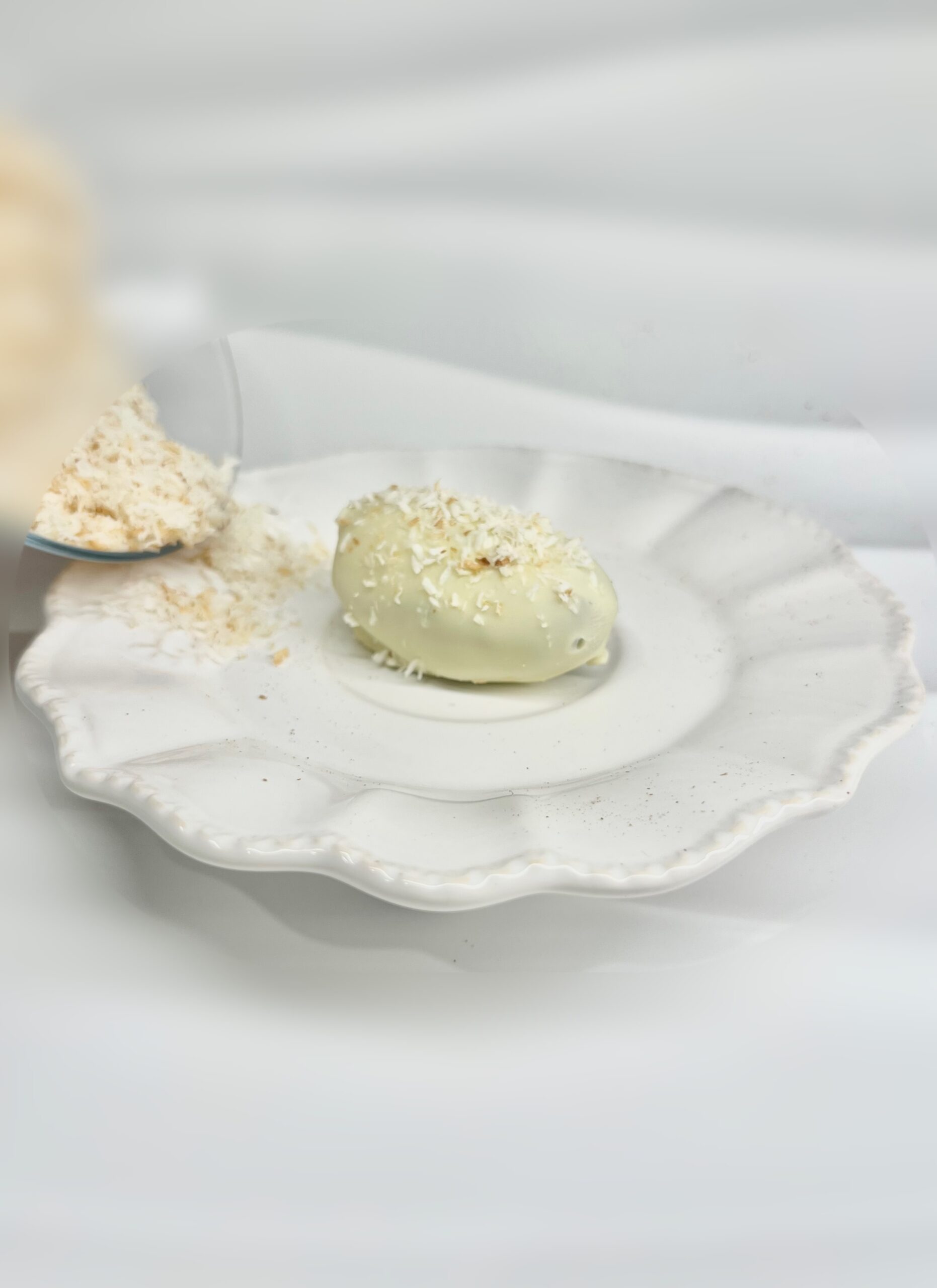 Fourrée de crème coco et noisette, enrobée de chocolat blanc et couverte de noix de coco