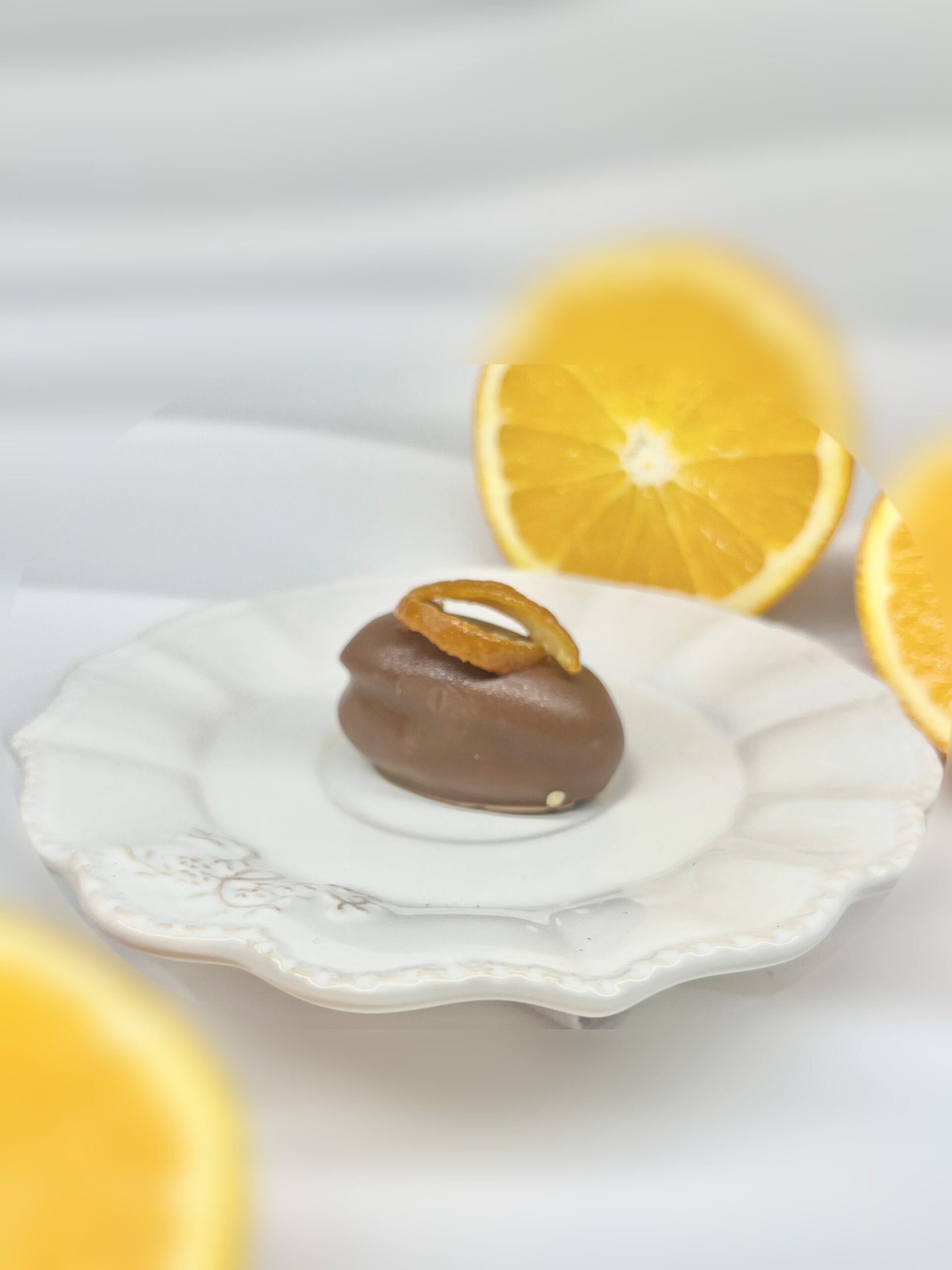 Fourrée d’un cœur d’orange confite fondante et parfumée, enveloppée d’un nappage chocolat au lait et intensément fruitée
