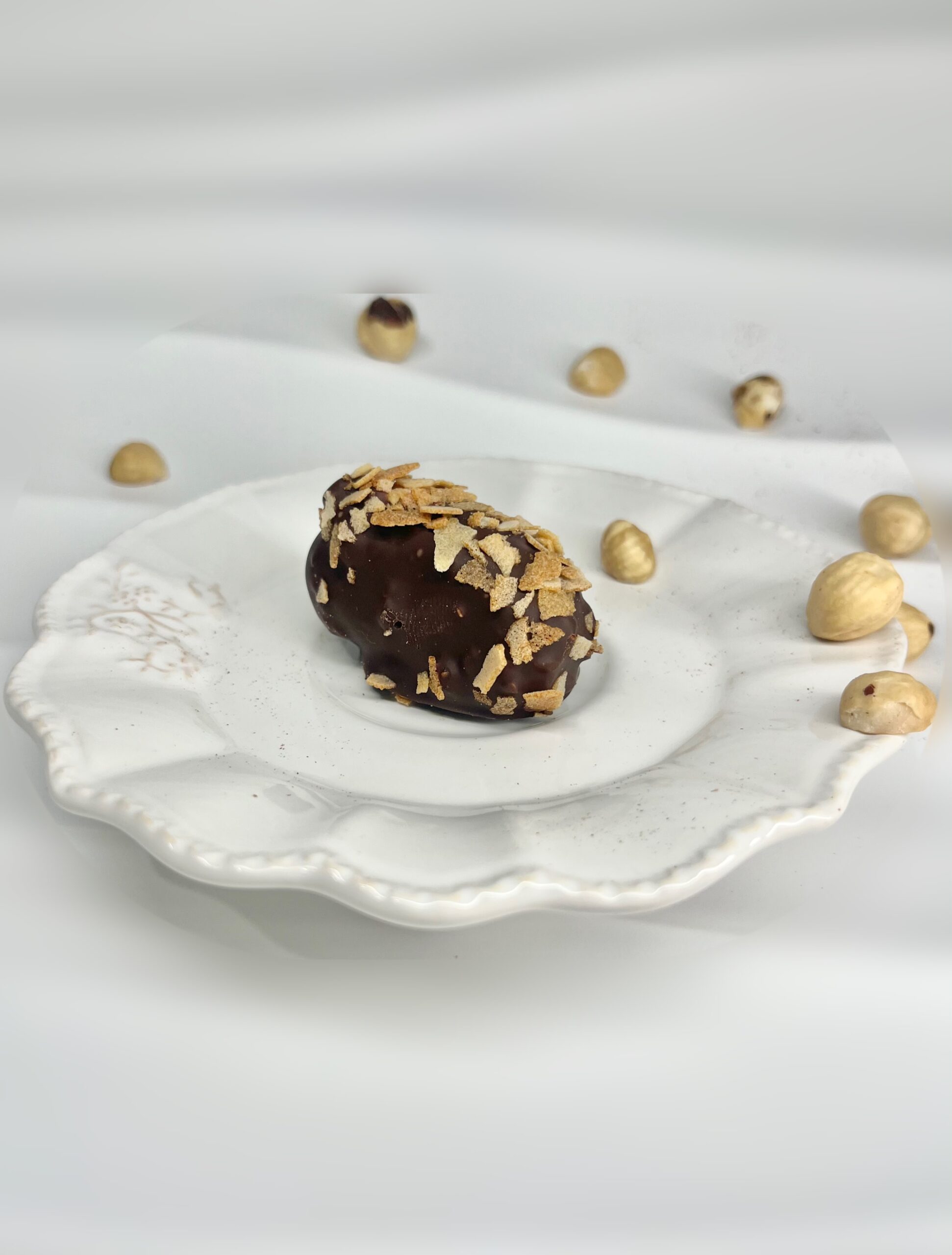 Fourrée de crème rocher onctueuse, de noisettes grillées et de feuilletine, enrobée de chocolat noir intense et d’éclats de feuilletines croustillantes